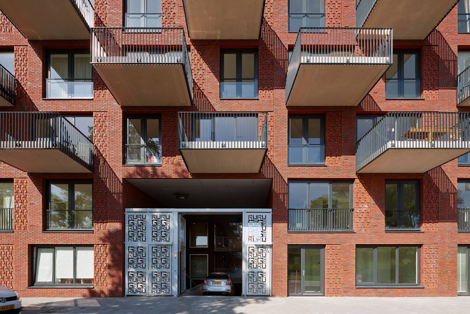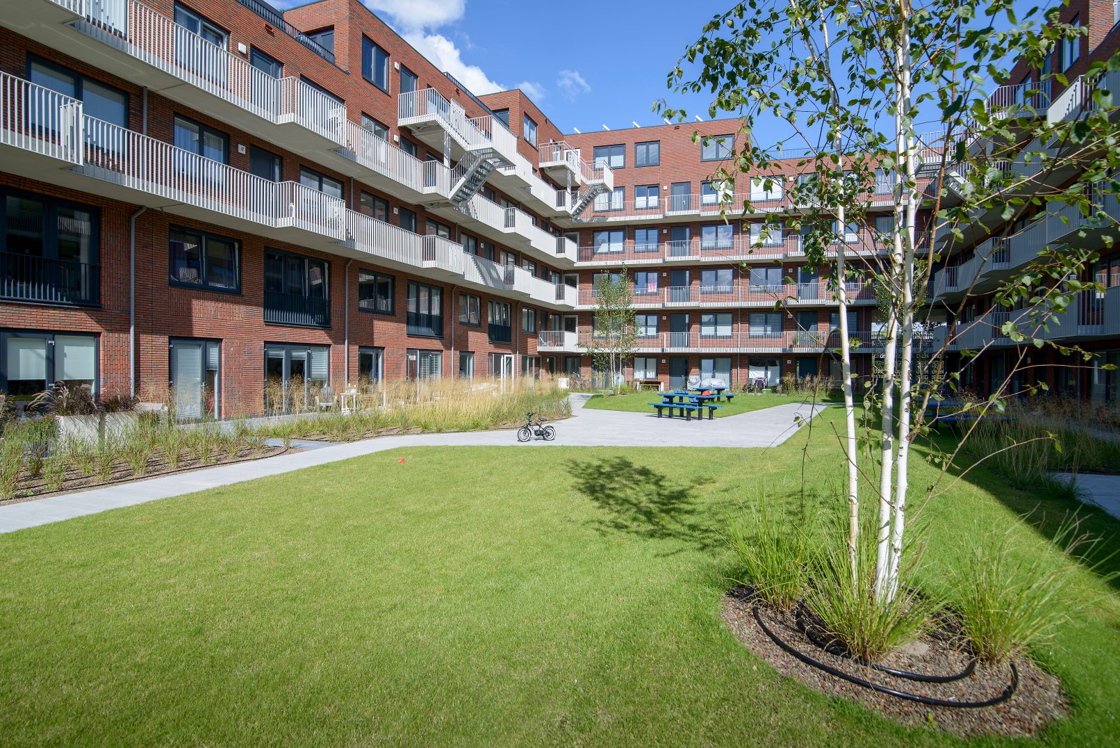 De woningen op de verdiepingen worden aan de binnenzijde van het blok ontsloten door een opvallende witte galerij die contrasteert met het rode baksteen. Bij de entrees van de woningen verbreedt de galerij zich iets, zodat de woningen makkelijk toegankelijk zijn. Deze ruimte kan ook door de bewoners gebruikt worden als buitenruimte of om planten neer te zetten. De omsloten binnentuin is vanaf de straat op twee plaatsen toegankelijk door een groot bijzonder gedetailleerd hek , waarvan er één tevens naar de parkeergarage leidt. Ook vanaf de binnenhoeken van de tuin, waar zich de hoofd stijgpunten bevinden, kunnen de bewoners de binnentuin betreden. Vanaf de hoger geleden verdiepingen kunnen de bewoners van de tuin genieten door de aanwezige bomen en weelderige grassoorten.