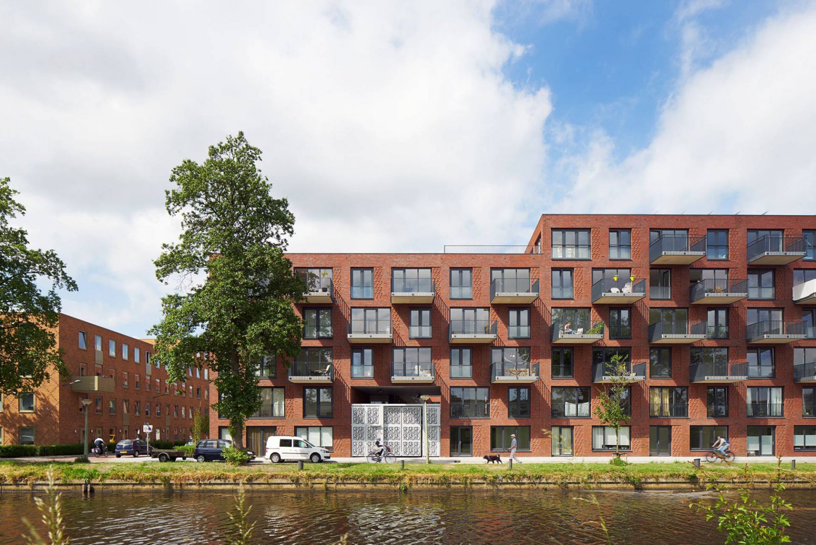 De woningen hebben verschillende buitenruimten, afhankelijk van de oriëntatie en positionering in het blok. Op de begane grond hebben de maisonnette woningen bijvoorbeeld een terras aan de binnentuin, aan de getrapte volumes op de bovenste verdieping hebben de appartementen een riante daktuin, op de kopse kant een volledig uitstekend balkon en aan de langszijde een half uitstekend balkon. Afhankelijk van de oriëntatie van de gevels zijn de balkons voor optimale bezonning recht boven elkaar geplaatst (noordgevel) of juist verspringend per verdieping (west-, zuid- en oostgevel). Door de grote ramen, opengewerkte balkons en veelheid aan buitenruimtes is er altijd een sterke verbinding met wat er zich op straatniveau en op het water van het Hoornsediep afspeelt. Rijkelijk gedetailleerd metselwerk en bijzondere entree hekwerken zorgen ervoor dat het nieuwe blok goed aansluit op de bestaande woonblokken van de Grunobuurt.