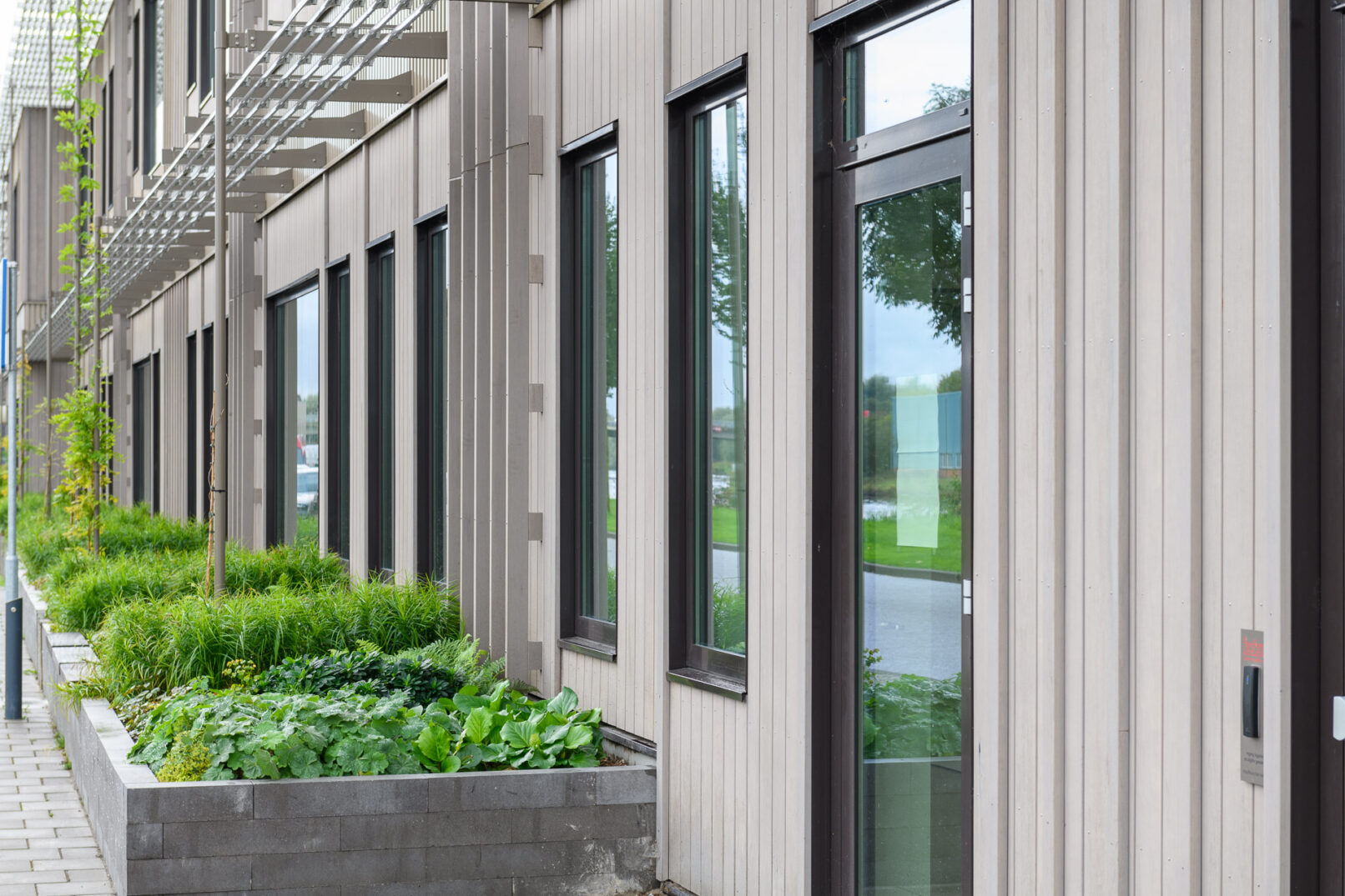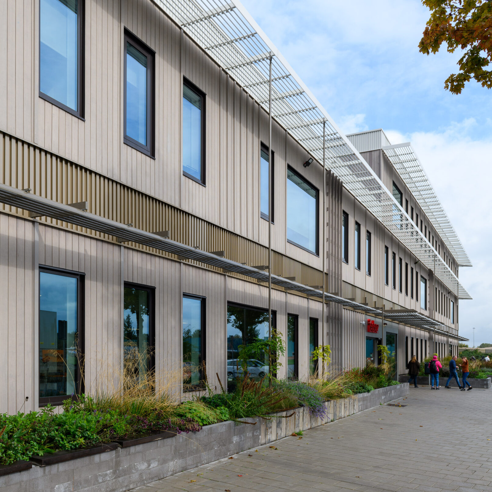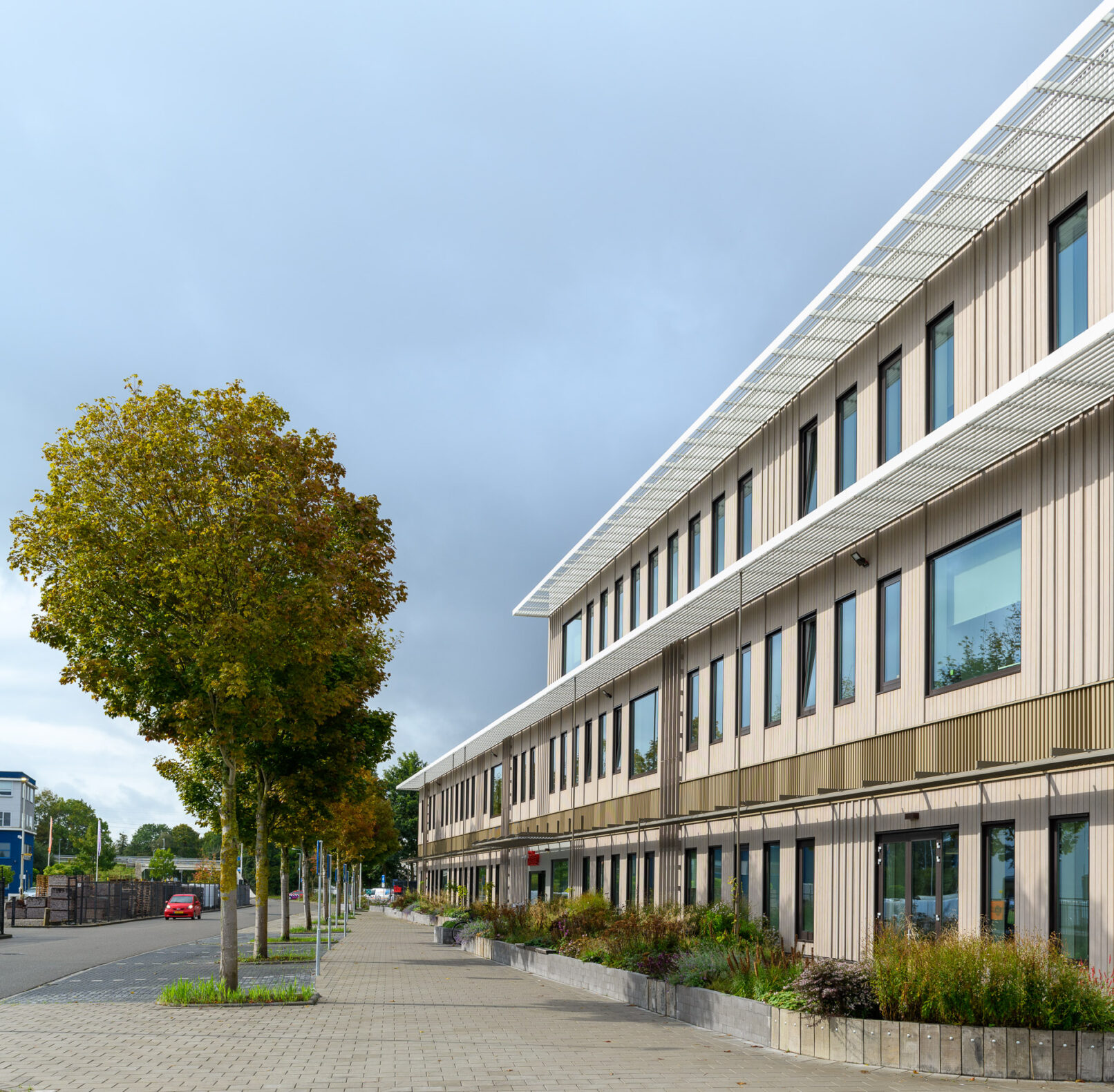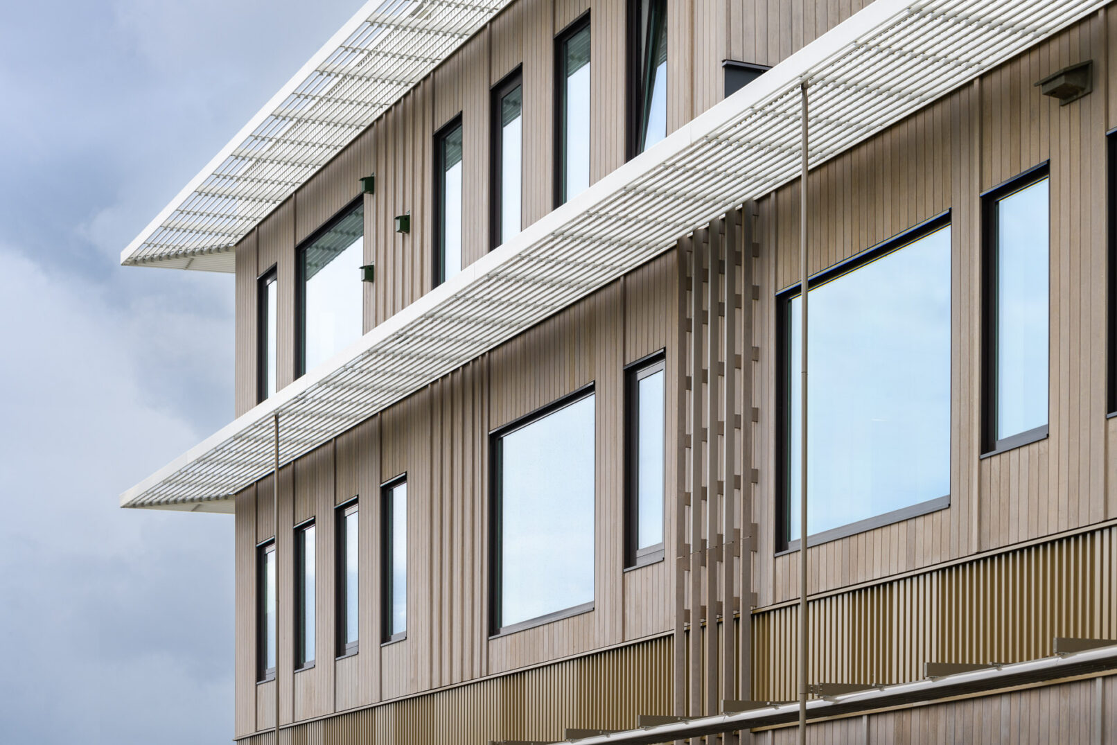 De gevel bestaat uit houten geveldelen onderbroken per verdieping door middel van een stalen gevelplaat die verschillende zettingen heeft die random in die banden zit en het geheel samen met de lamellen luifels op een HSB wand. Hier was een leuke uitdaging hoe de lamellen constructie op te hangen aan de binnenconstructie wind en water dicht.