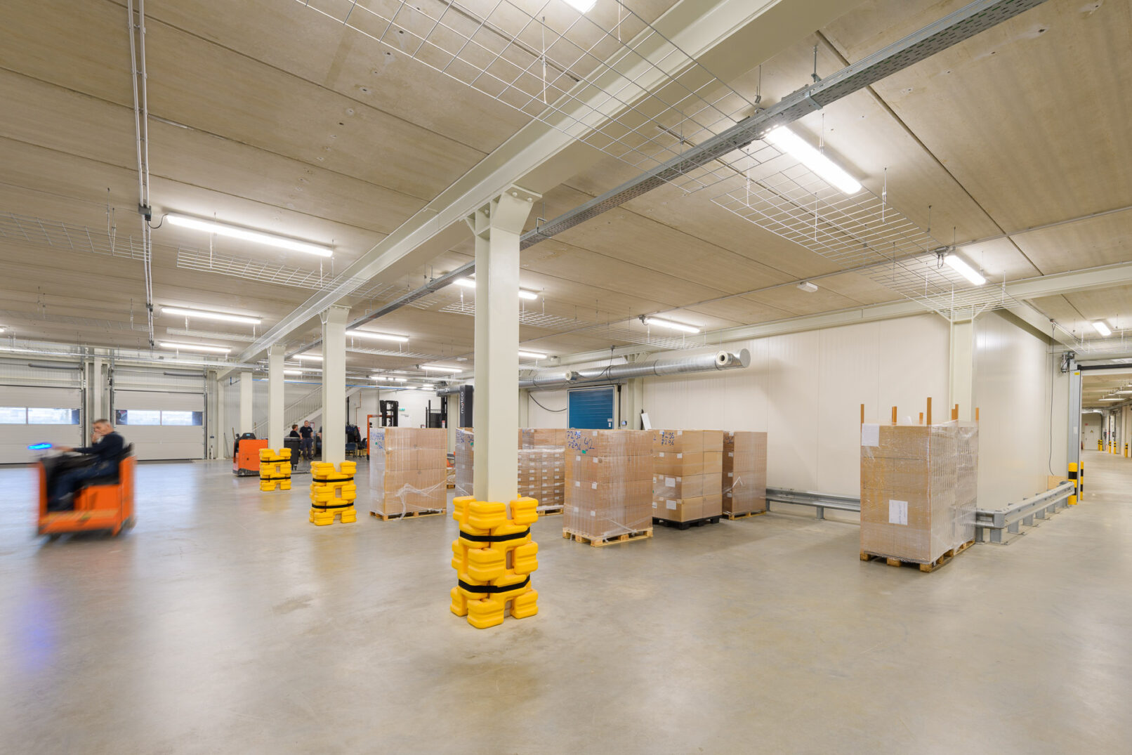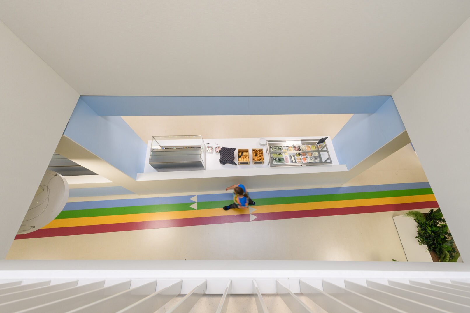 De hoofdentree zijde is de kantine/restaurant/ administratie en kantoor 3 lagen hoog en doormiddel van regenboog way signing kleuren worden de werknemers naar hun werkafdeling geleid. Dit gebeurt over 2 lagen naar achteren toe.