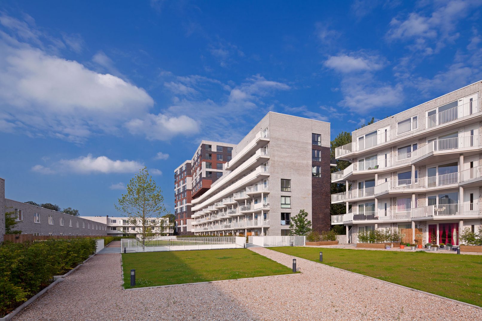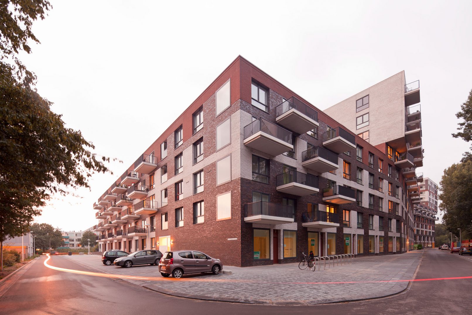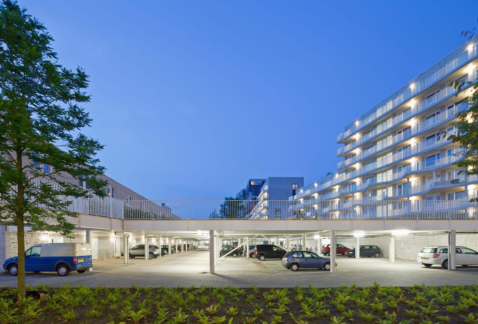 On the façade several colours of brick bands rap the building to match the rest of the neighbourhood, which is characterised by repetition and horizontal accents. The deck will have sports and games facilities, pathways, and cutouts for trees. The park-like quality acquired by the complex, makes Loevenhout a worthy entrance to Overvecht.