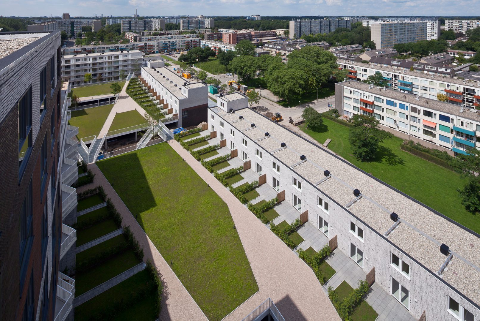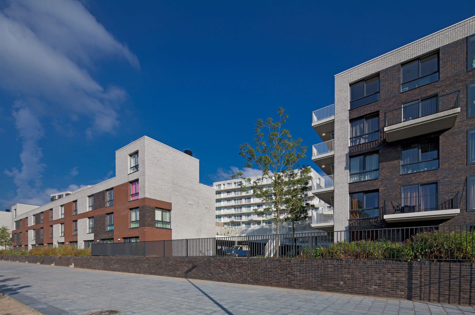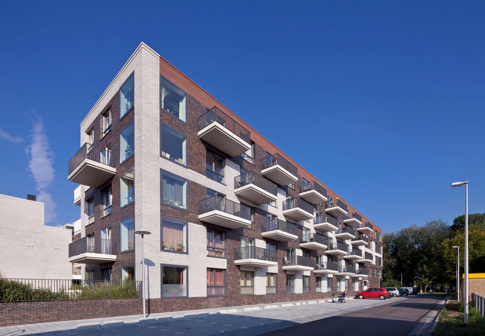 On the façade several colours of brick bands rap the building to match the rest of the neighbourhood, which is characterised by repetition and horizontal accents. The deck will have sports and games facilities, pathways, and cutouts for trees. The park-like quality acquired by the complex, makes Loevenhout a worthy entrance to Overvecht.